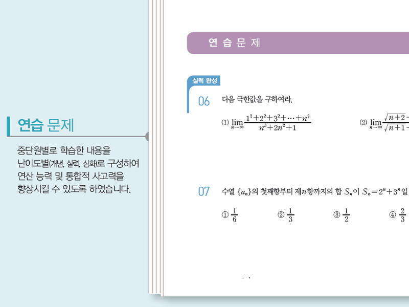 - 중단원별로 학습한 내용을 난이도별(개념, 실력, 심화)로 구성하여 연산 능력 및 통합적 사고력을 향상시킬 수 있도록 하였습니다.