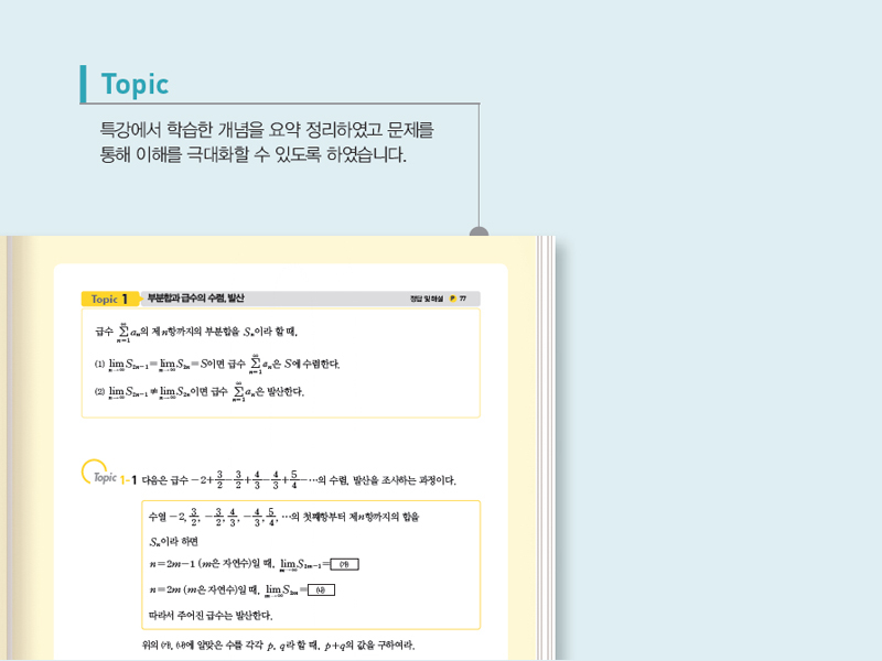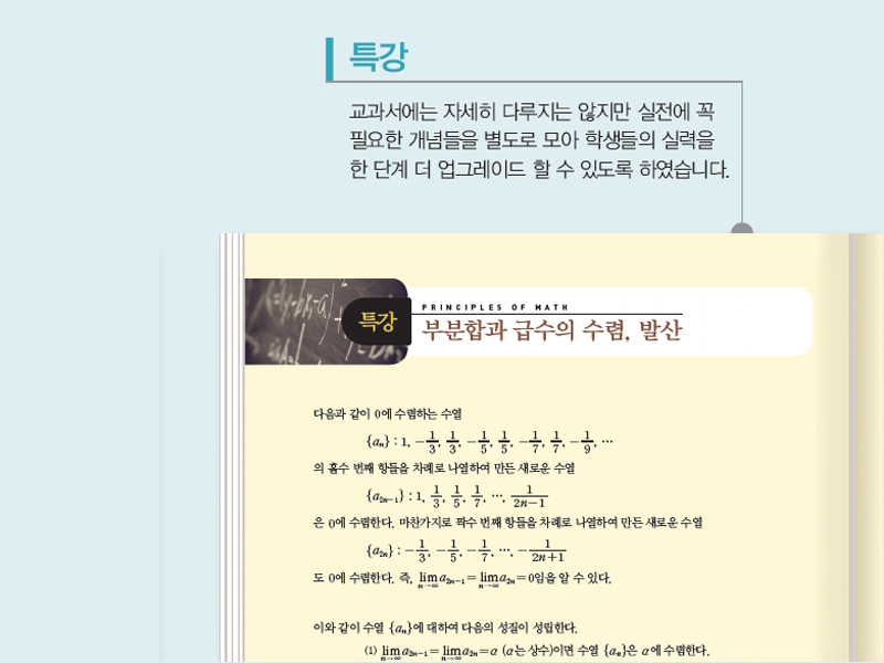 - 교과서에는 자세히 다루지는 않지만 실전에 꼭 필요한 개념들을 별도로 모아 학생들의 실력을 한 단계 더 업그레이드 할 수 있도록 하였습니다.