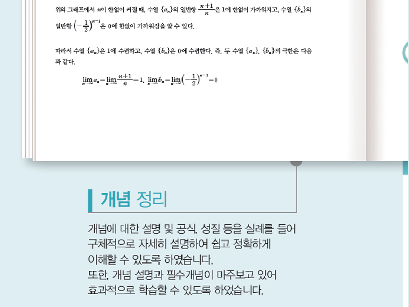 - 개념에 대한 설명 및 공식, 성질 등을 실례를 들어 구체적으로 자세히 설명하여 쉽고 정확하게 이해할 수 있도록 하였습니다. 또한, 개념 설명과 필수개념이 마주보고 있어 효과적으로 학습할 수 있도록 하였습니다.