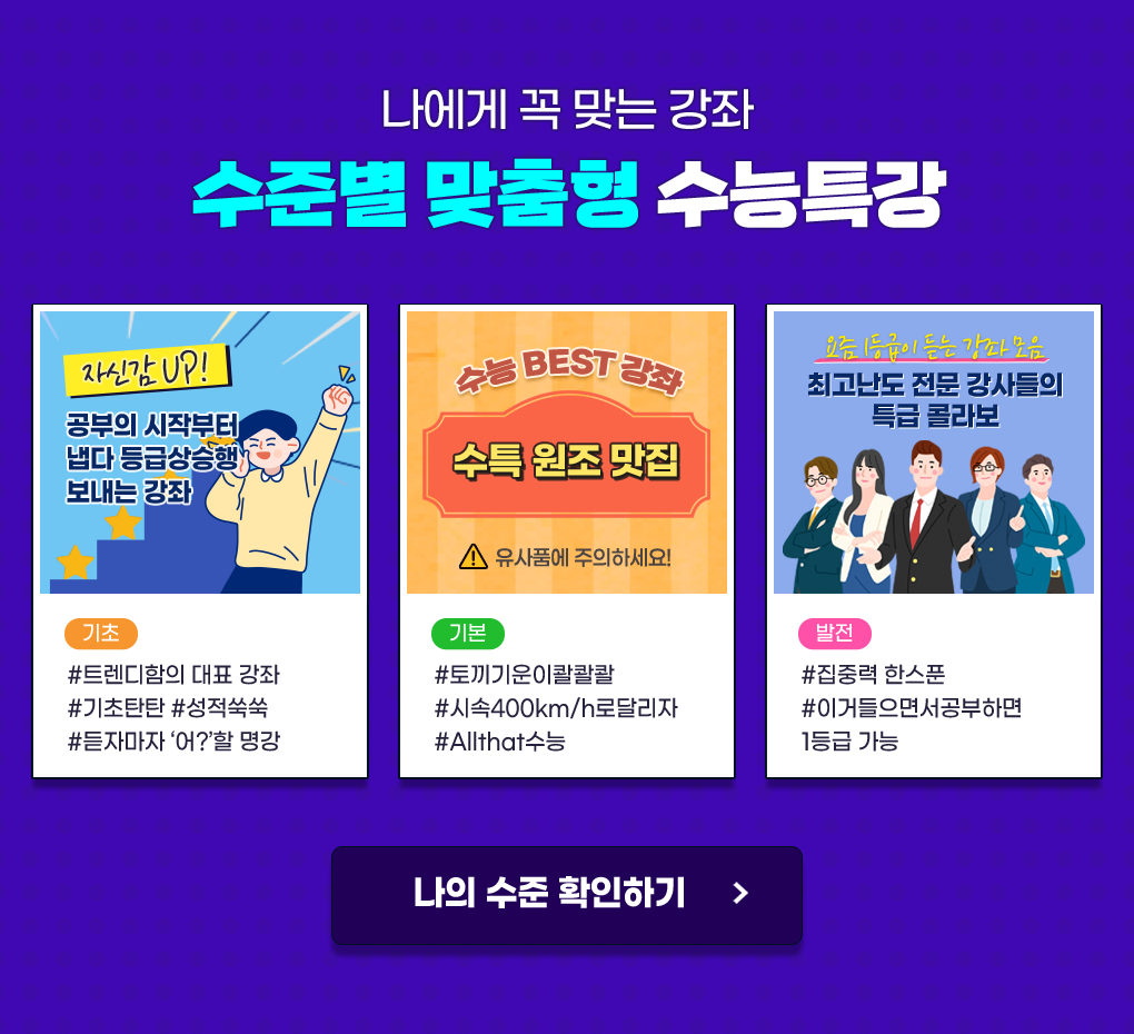 나에게 꼭 맞는 강좌 수준별 맞춤형 수능특강자신감 up 공부의 시작부터 냅다 등급상승행 보내는 강좌기초#트렌디함의 대표 강좌#기초탄탄 #성적쑥쑥#듣자마자'어?'할 명강수능 best 강좌 수특 원조 맛집 유사품에 주의하세요!기본#토끼기운이콸콸콸#시속400km/h로달리자#Allthat수능요즘 1등급이 듣는 강좌 모음 최고난도 전문 강사들의 특급 콜라보발전#집중력 한스푼#이거들으면서공부하면 1등급 가능