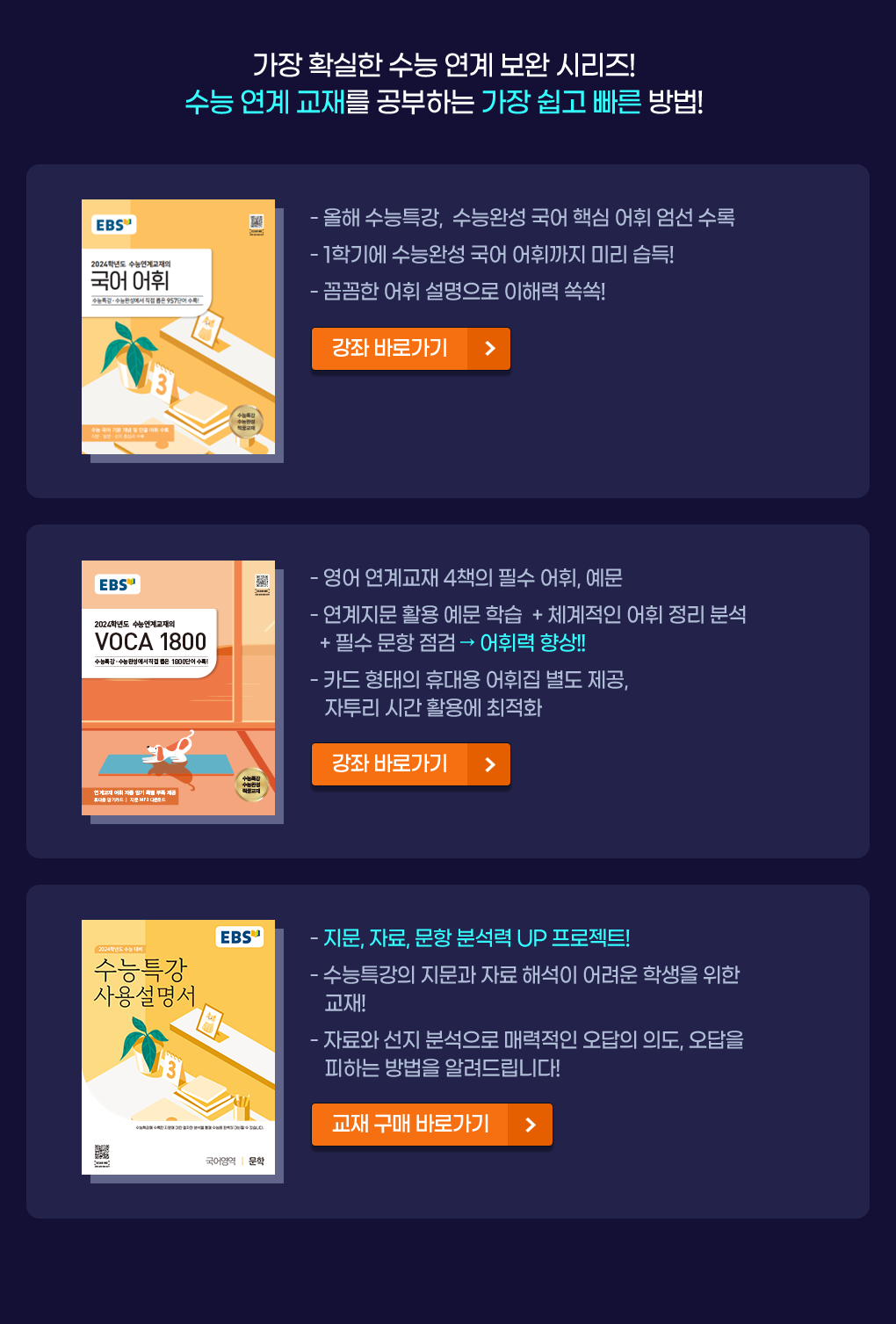 가장 확실한 수능 연계 보완 시리즈! 수능 연계 교재를 공부하는 가장 쉽고 빠른 방법!수능연계교재의 국어 어휘올해 수능특강, 수능완성 국어 핵심 어휘 엄선 수록1학기에 수능완성 국어 어휘까지 미리 습득!꼼꼼한 어휘 설명으로 이해력 쏙쏙!수능연계교재의 VOCA 18002023학년도 영어 연계교재 4책의 필수 어휘, 예문연계지문 활용 예문 학습 +체계적인 어휘 정리 분석 +필수 문항 점검 → 어휘력 향상!!카드 형태의 휴대용 어휘집 별도 제공, 자투리 시간 활용에 최적화수능특강 사용설명서지문, 자료, 문항 분석력 UP 프로젝트!수능특강의 지문과 자료 해석이 어려운 학생을 위한 교재와 강의!자료와 선지 분석으로 매력적인 오답의 의도, 오답을 피하는 방법을 알려드립니다!