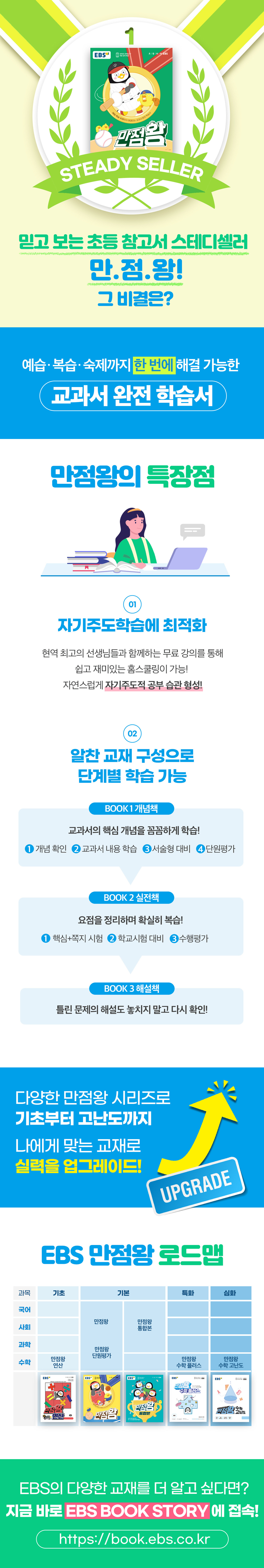 만점왕 한 권으로 학교 진도에 따라 공부해 보세요. 개념책에는 학습 개념, 실전책에는 단원별 핵심정리와 확인 문제가 있습니다. 재미있는 무료 강의가 있어 만점왕과 함께라면 혼자서도 쉽게 공부할 수 있습니다. 예습·복습·숙제까지 해결되는 교과서 완전 학습서, 초등부터 “EBS 만점왕”과 함께 하세요.