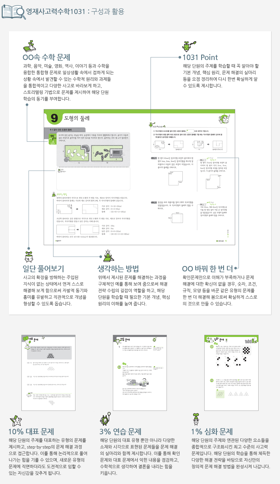 과학, 스포츠, 음악, 미술, 영화, 이야기 등과 수학을 융합한 통합형 문제를 수록하여, 학생들이 일상생활에서 발견할 수 있는 수학적 원리와 과제들을 통합적이고 다양한 사고로 바라보게 함으로써 창의적으로 문제를 해결할 수 있는 능력을 길러 줍니다.