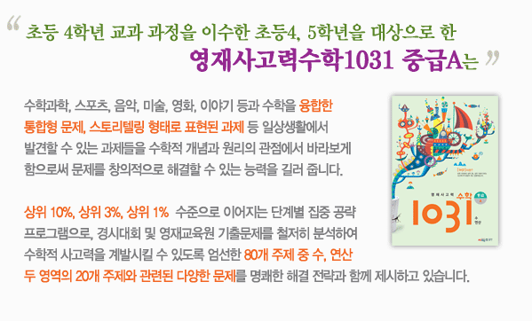 영재사고력수학1031은 상위 10%, 상위 3%, 상위 1% 수준으로 이어지는 단계별 집중 공략 프로그램입니다. 초등 및 중등 영재교육원 기출문제와 외국어고등학교, 과학고등학교 및 대학수학능력시험의 창의사고력 기출문제를 철저히 분석함으로써 영재교육원을 준비하는 학생 뿐만 아니라 초등 수학 실력 완성을 필요로 하는 학생이라면 반드시 알아야 할 내용을 8대 영역, 200개 주제, 360개 유형의 다양한 문제와 명쾌한 해결 전략으로 제시하고 있습니다.